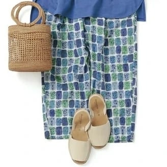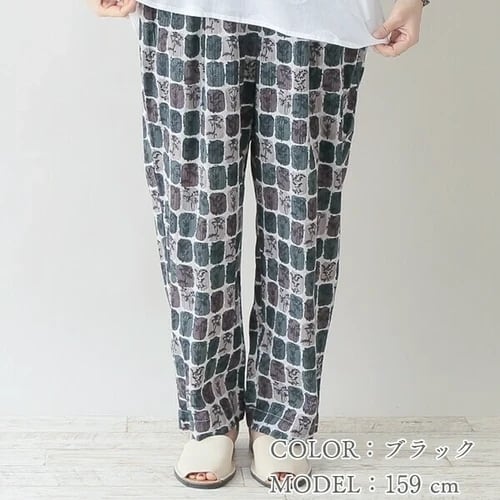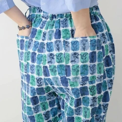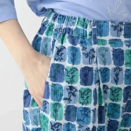 刺し子のようなステッチワークが美しい、コットンドビーにボタニカルなモチーフをプリントしたパンツ。